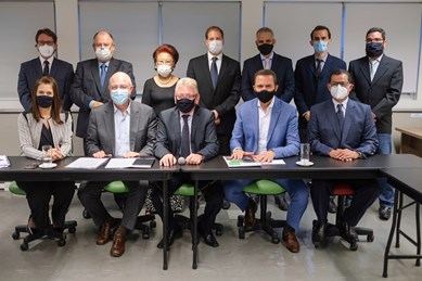 O vice-governador do Estado de SP, Rodrigo Garcia, o secretário de Agricultura e Abastecimento, Itamar Borges, e o secretário-executivo,