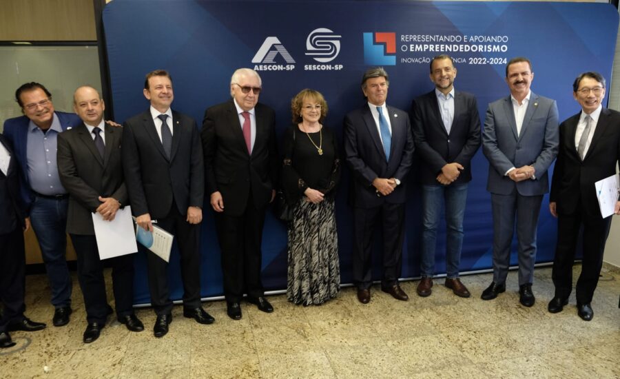 O presidente da Frente Parlamentar do Empreendedorismo, deputado estadual Itamar Borges, e representantes do Sescon-SP, FercomercioSP, Associação Comercial e