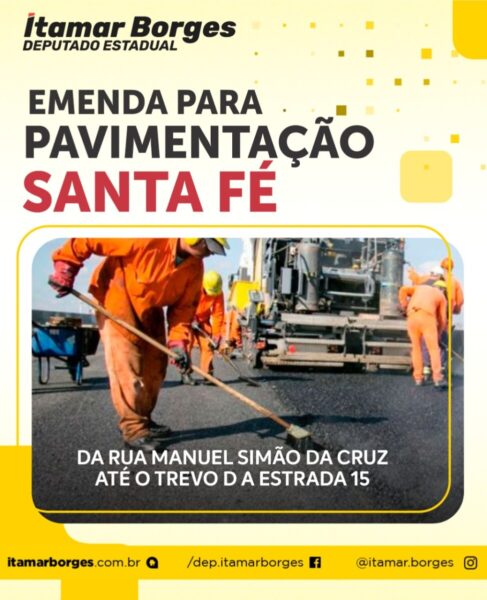 A cidade de Sana Fé do Sul recebeu emenda de R$1 milhão, destinada pelo deputado estadual Itamar Borges, para a pavimentação asfáltica, guias e sarjetas e drenagens pluviais da Rua Manuel Simão da Cruz até o cruzamento da Estrada 15. O recurso já foi disponibilizado para a prefeitura.