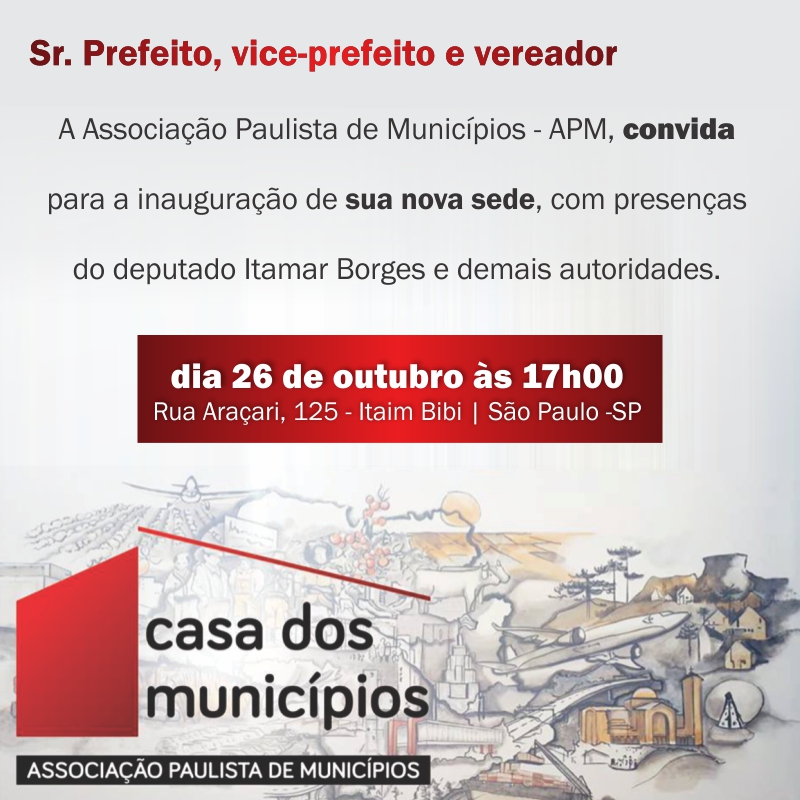 A Associação Paulista de Municípios - APM, convida para a inauguração de sua nova sede, com presenças do